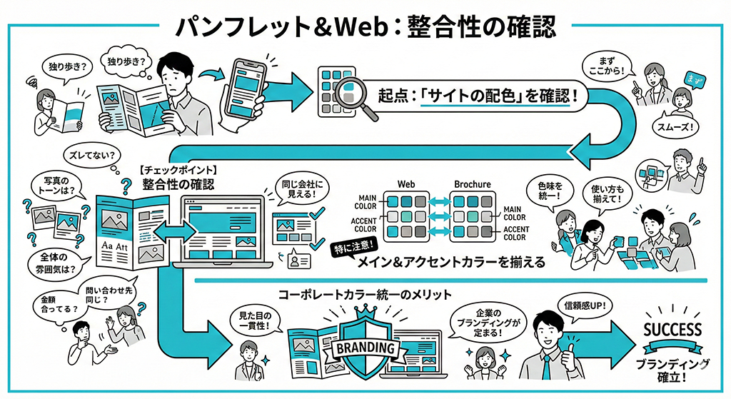 パンフレットだけが独り歩きしないように、ウェブサイトとの整合性も必ず確認しましょう。