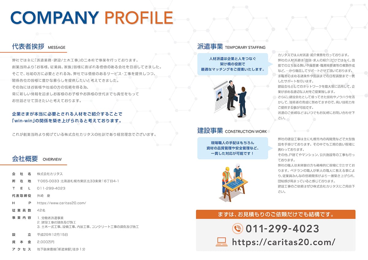 WORK パンフレット制作事例 HOME>制作事例[A4仕上がり二つ折]>株式会社カリタス 株式会社カリタス 様 制作事例[A4仕上がり二つ折] 使用テンプレート B-030 所在地 北海道 業種 建設業 イメージ 表面 中面 B-030 テンプレートを見る PREV NEXT