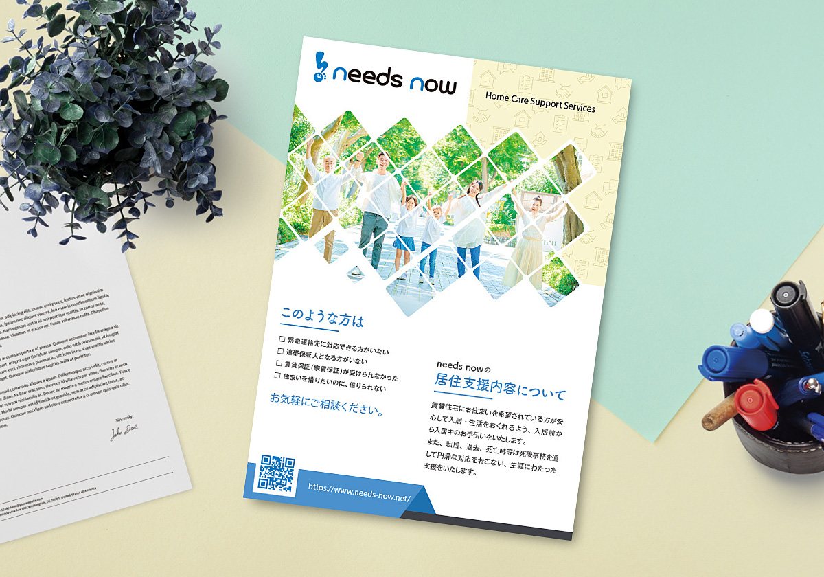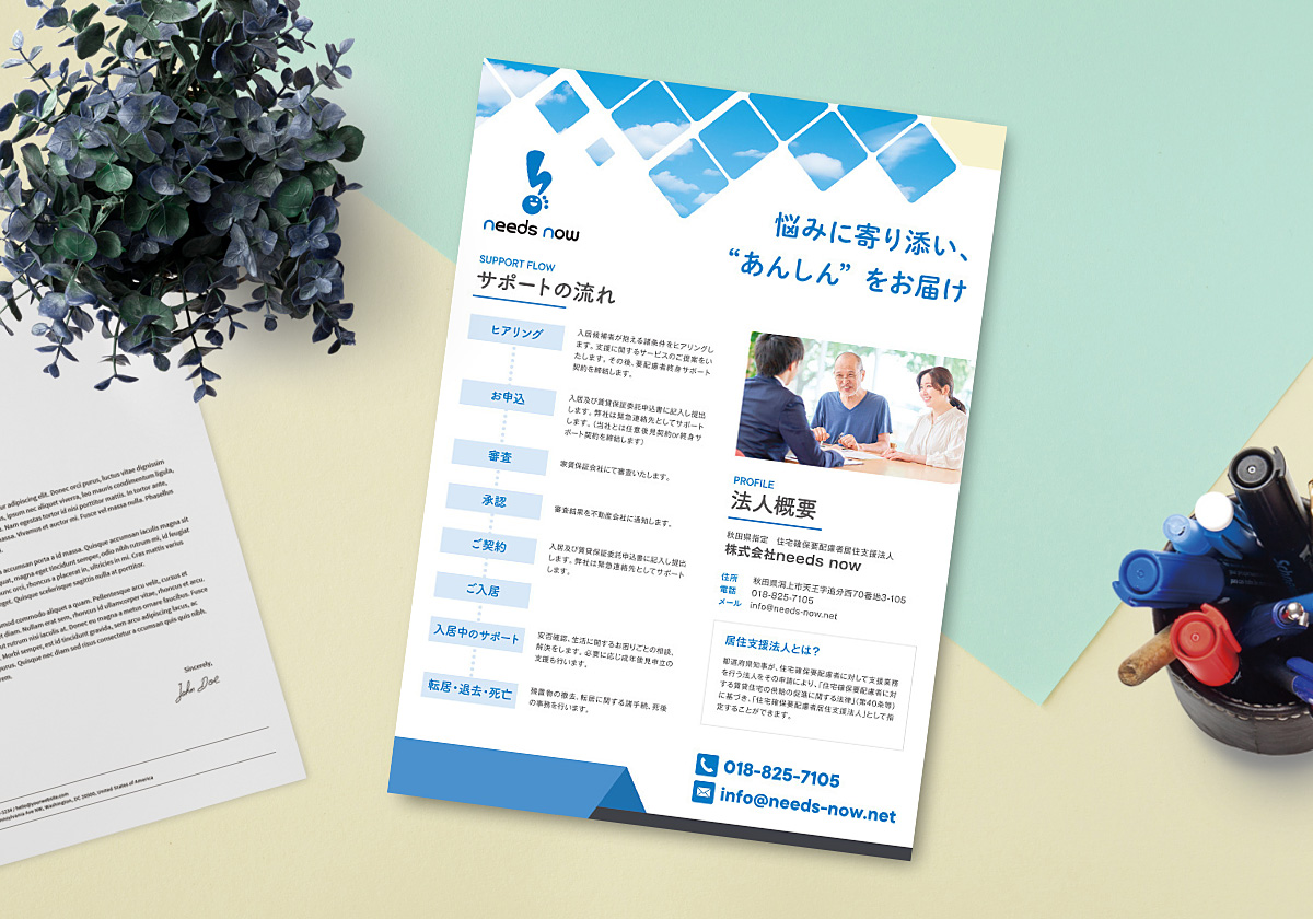 WORK パンフレット制作事例 HOME>制作事例[A4折なし]>needs now needs now 様 制作事例[A4折なし] 使用テンプレート F-005 所在地 秋田県 業種 医療・介護・福祉 イメージ 表面 裏面 F-005 テンプレートを見る PREV