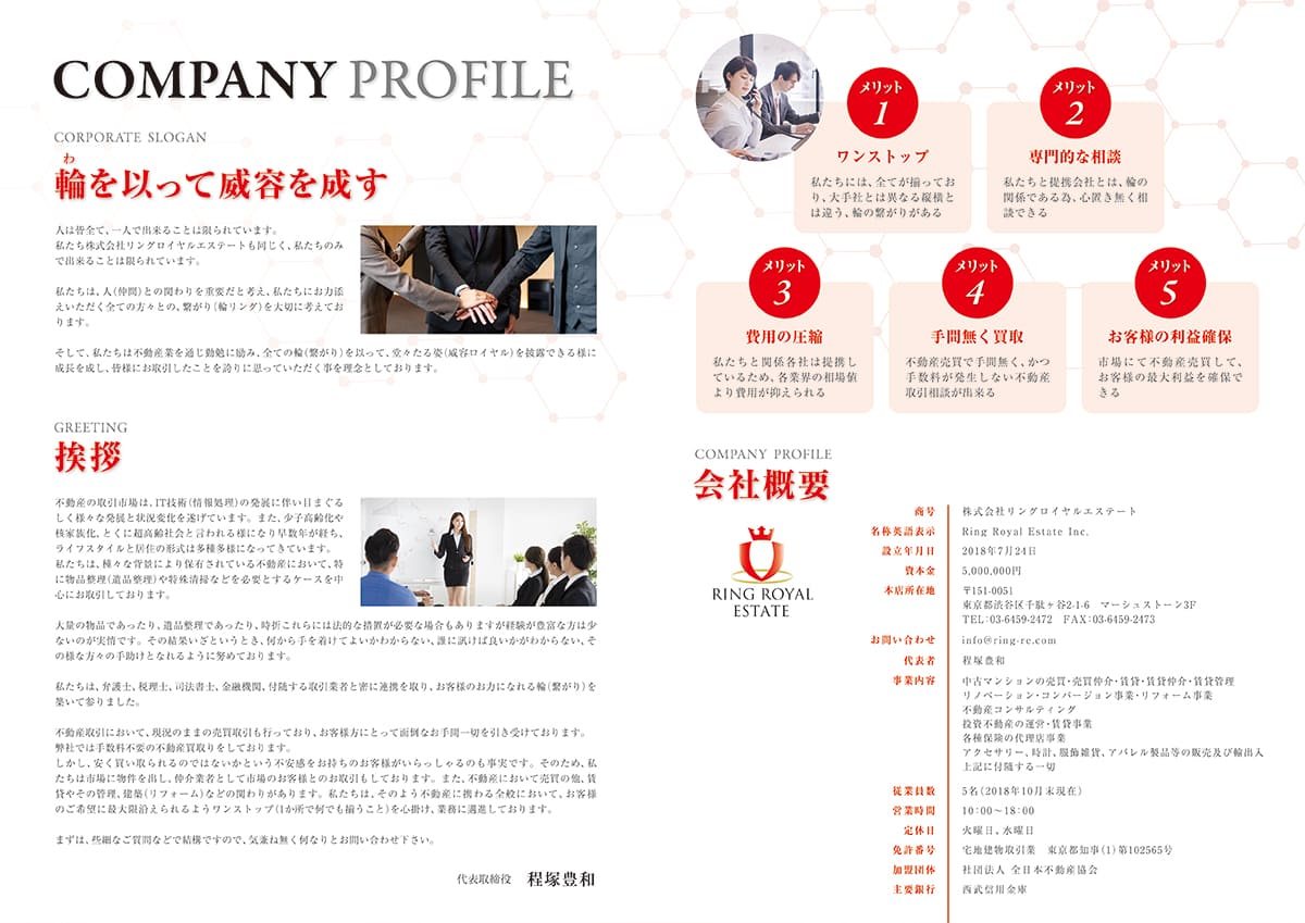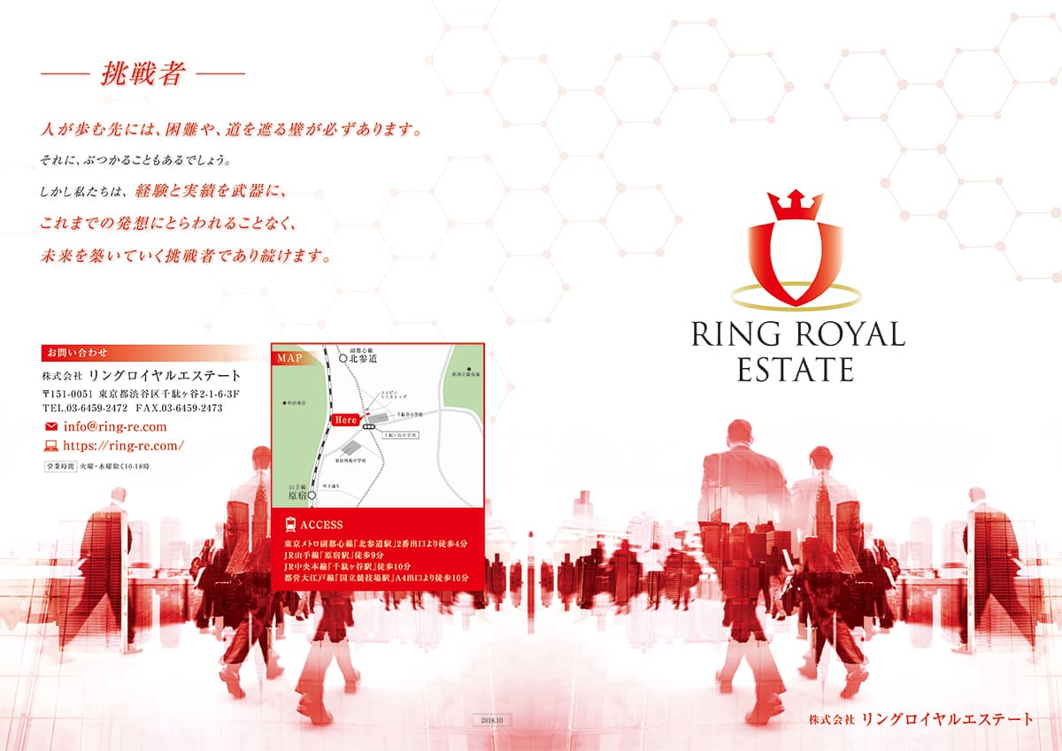 WORK パンフレット制作事例 HOME>制作事例[A4仕上がり二つ折]>株式会社リングロイヤルステート 株式会社リングロイヤルステート 様 制作事例[A4仕上がり二つ折] 使用テンプレート B-030 所在地 東京都 業種 不動産業 イメージ 表面 中面 B-030 テンプレートを見る PREV NEXT